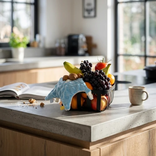 De metalen mand is 19,5 bij 19,5 cm en is 10 cm hoog en is gevuld met het volgende fruit:
