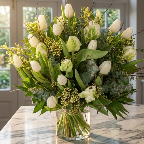 Een mooi boeket witte tulpen met een winters tintje en tegelijk ook weer bloemen voor het voorjaar !