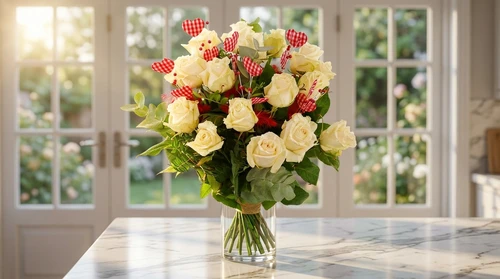 Door beschikbaarheid van de witte rozen kunnen deze afwijken van de foto.